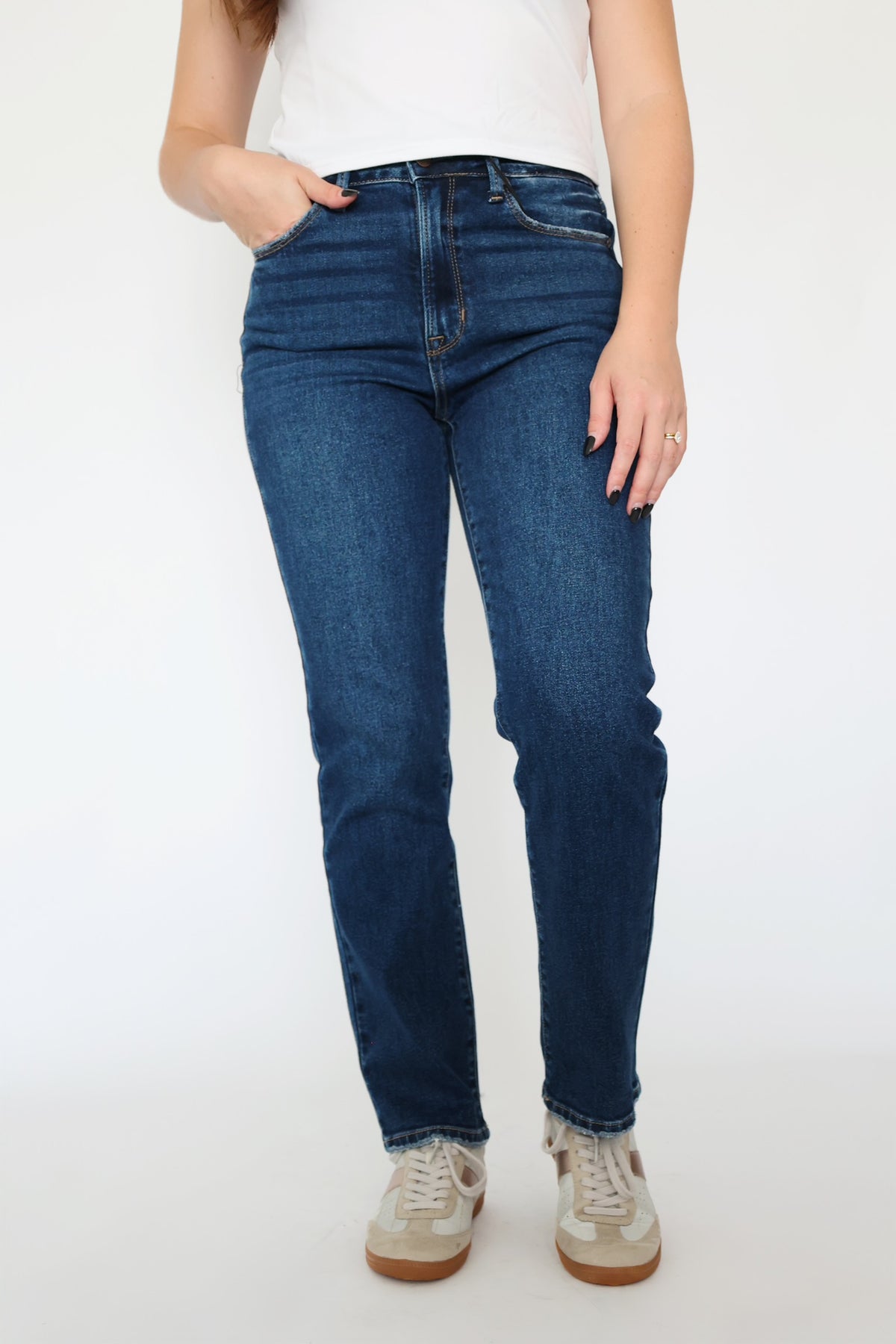 A STRETCH DENIM JEAN WITH A CURVE DEFINIGN HIGH RISE NOW AVAILABLE IN A DARK DENIM WASH. FEATURING CLEAN DETAILS AND HEM - MASTER THE ICONIC 90'S STRAIGHT LEG LOOK WITH ONE SIMPLE WARDROBE ADDITION.