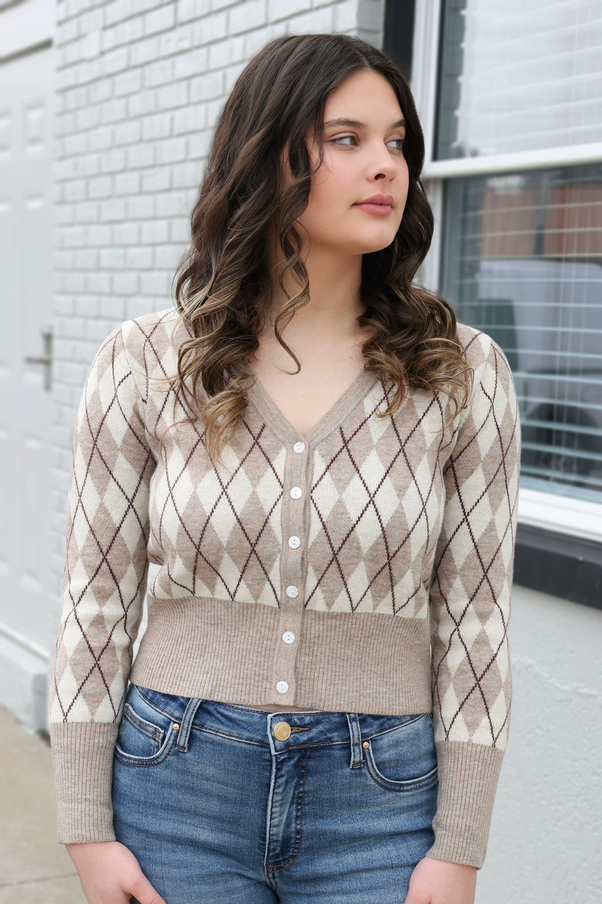 A timeless knitwear piece with a modern touch, this argyle knit cardigan brings a polished yet versatile aesthetic to your wardrobe. Designed with a deep V-neckline and a button-down front, it features a classic diamond argyle pattern across the body and sleeves, highlighted by ribbed trim at the cuffs and hem. The cropped silhouette adds a contemporary feel, making it ideal for pairing with high-waisted skirts, denim, or trousers. Lightweight and comfortable, this cardigan transitions seamlessly from work to casual weekends, offering endless styling possibilities for layering or stand-alone wear. - Classic argyle knit pattern - Deep V-neckline with button-down front - Ribbed hem and cuffs for a tailored fit - Cropped length with long sleeves - Soft and lightweight knit texture Tags: Argyle Knitwear, Cropped Cardigans, Long Sleeve Cardigans, Preppy Sweaters