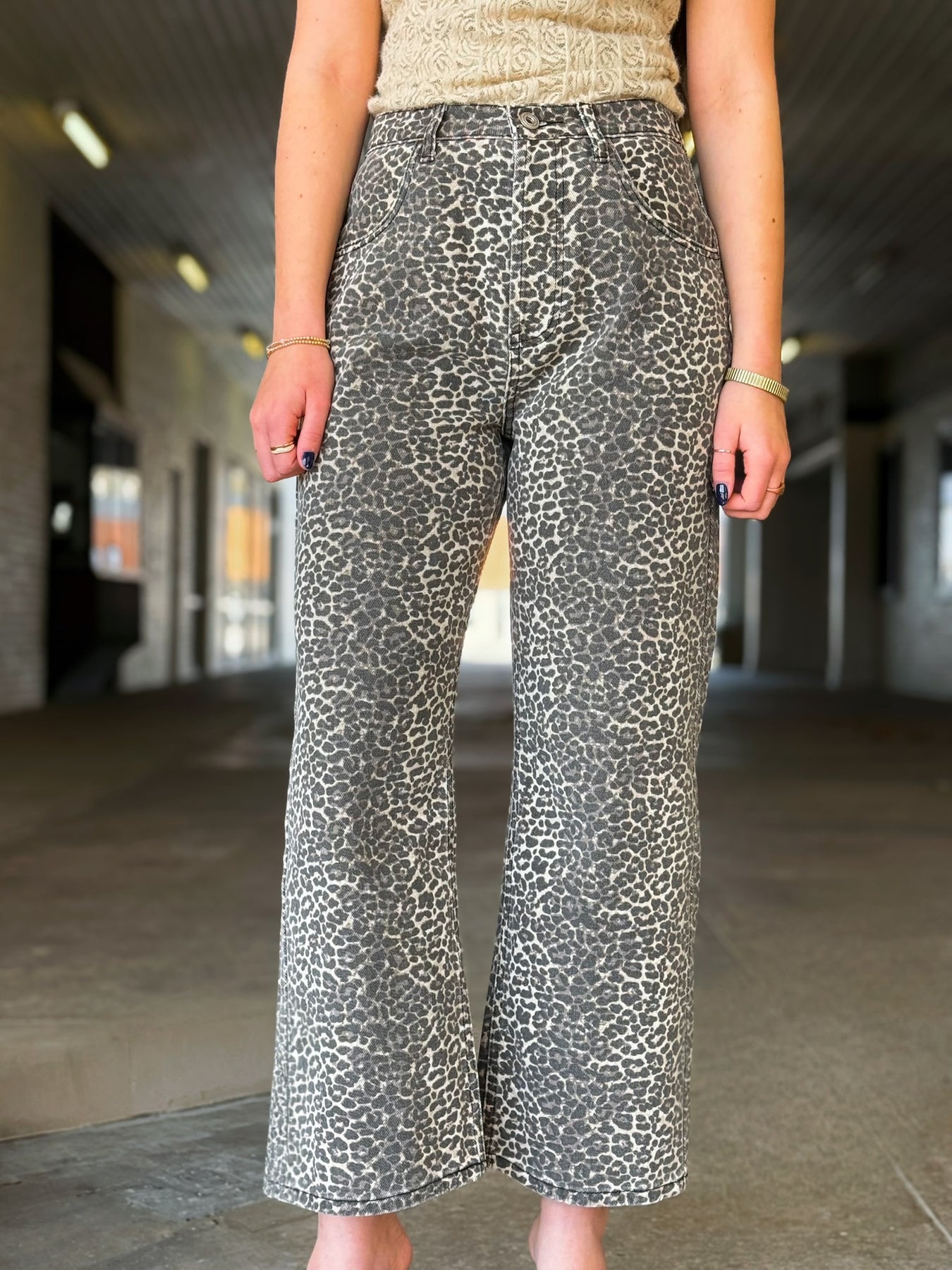 - Leopard print straight leg jeans