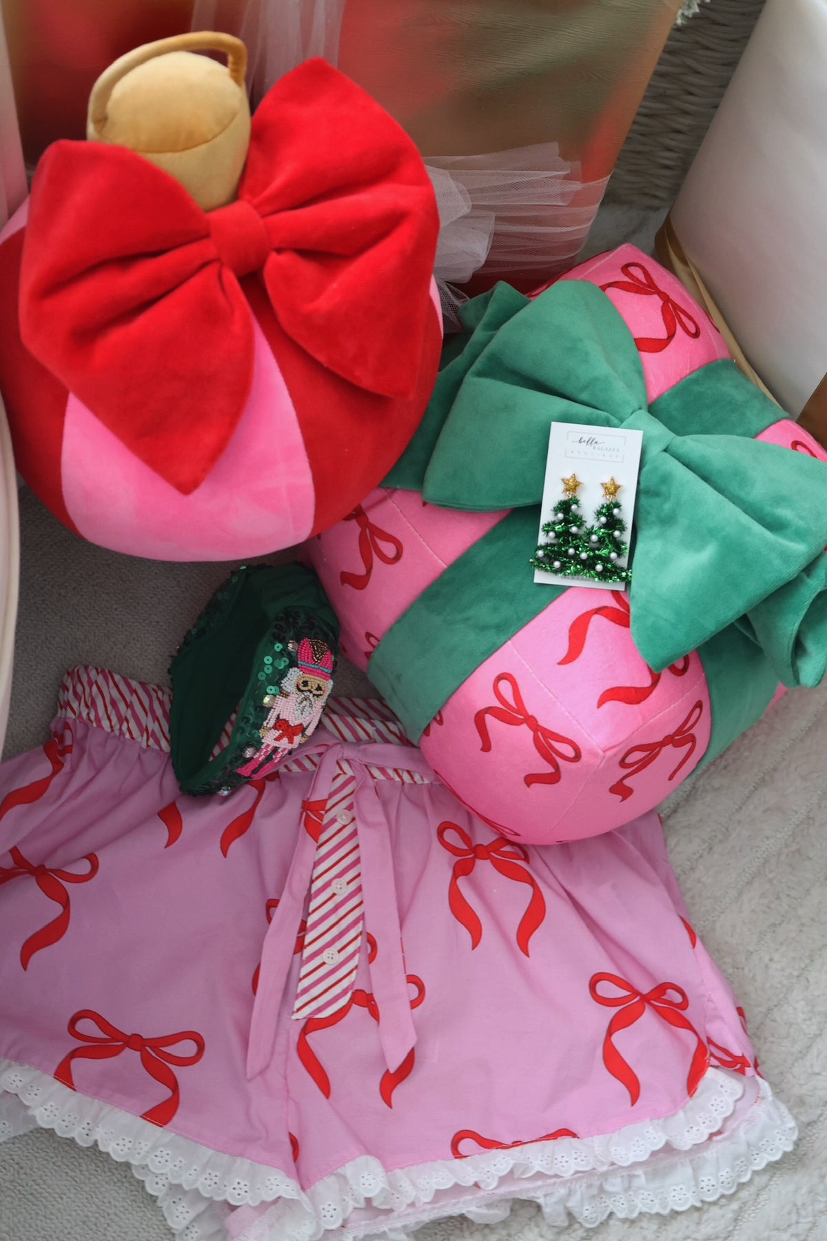 Add a dose of festive flair to your decor with the Bow Gift Box Medium Pillow. Wrapped in a pink plush base with an all-over red bow print, it’s topped with a lush green velvet ribbon and oversized bow for an extra pop of cheer. Its cube shape makes it the perfect accent for couches, beds, or even under the tree as a cozy faux gift. Super soft and stuffed just right, this pillow brings playful holiday vibes to any space.