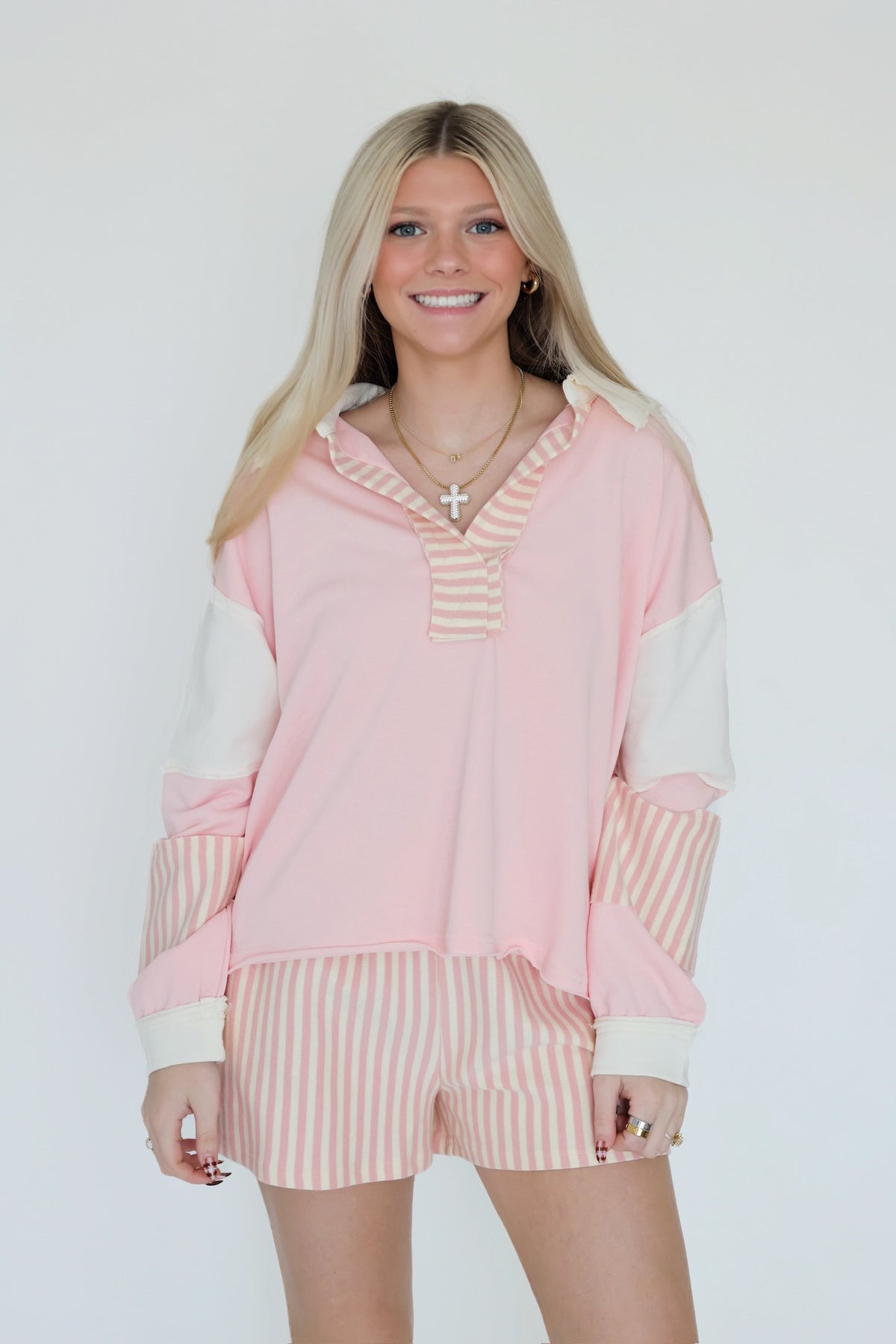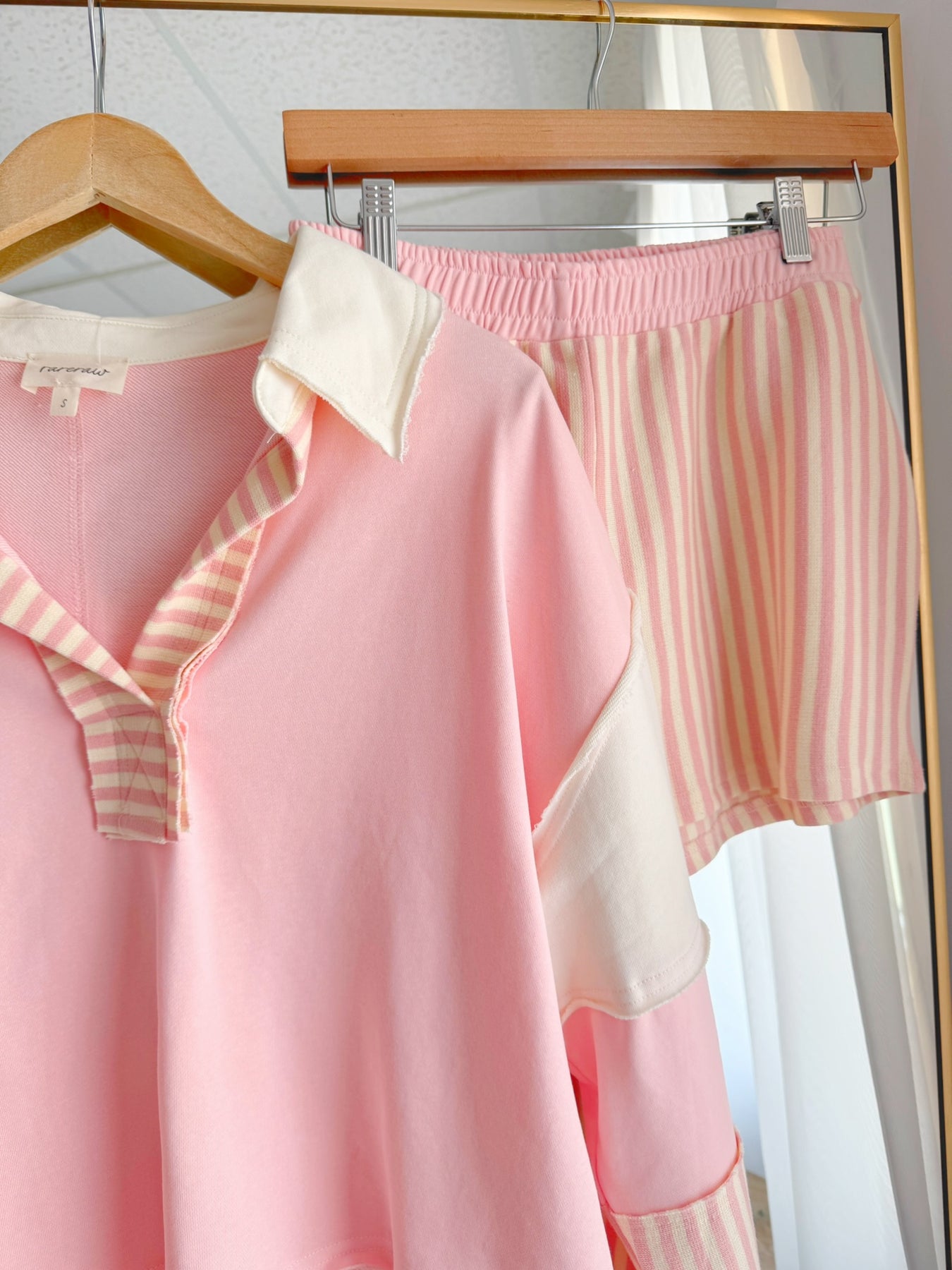 Two-piece lounge set featuring a relaxed pullover and striped shorts