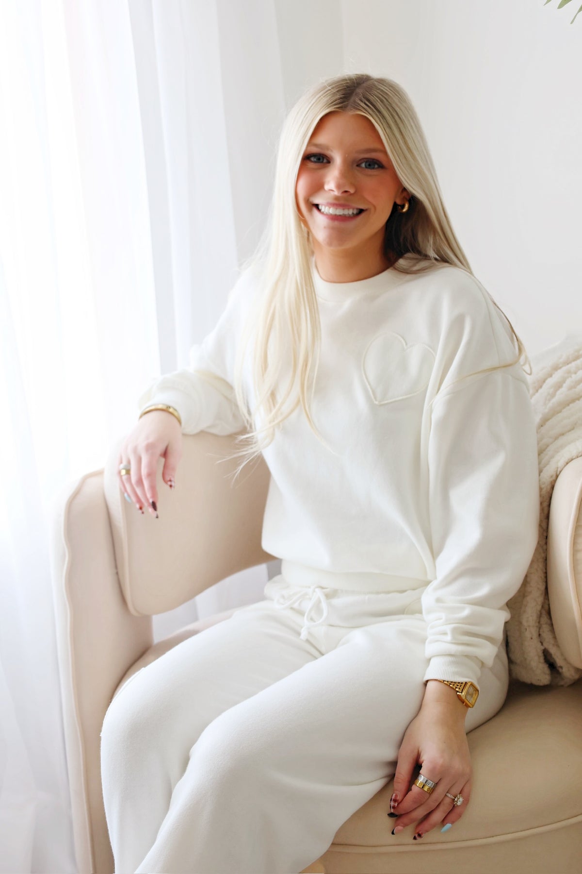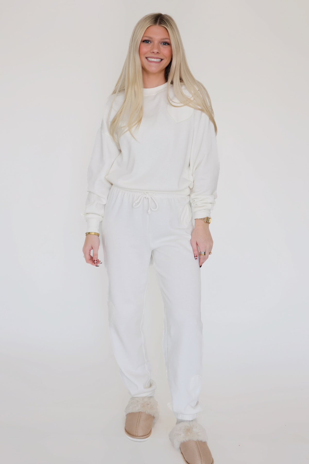 This plush cotton-blend sweatshirt wraps you in softness with tonal heart appliqués that add a playful touch. Perfect for layering over your favorite lounge bottoms, it’s made for cozy nights and quiet mornings at home.