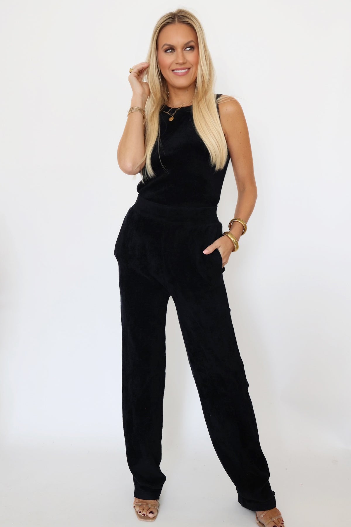 Tapered leg pant, regular cut with slant pockets & elastic waist in soft pile chenille rib. Versatility of vogue pairing for any ensemble, plush pile luxury... touch of elegance! Solid color yarn on standard fit.