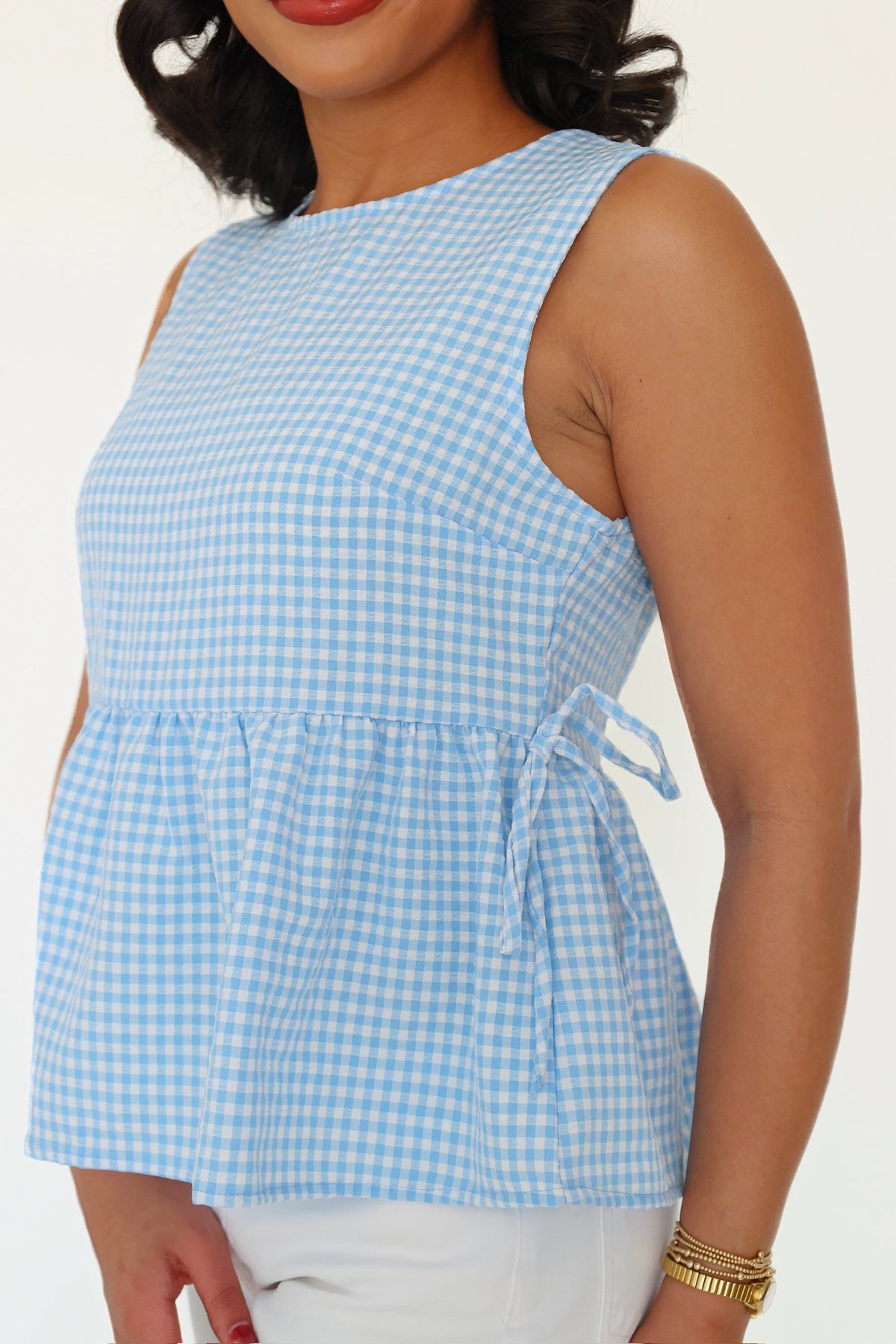 Embrace sunny days with this textured gingham, designed for effortless charm. It features a classic round neckline and a breezy sleeveless cut. The silhouette is defined by a playful peplum hem accented with delicate side tie details. Finished with a back keyhole button closure, pair it with high-waisted denim for a chic daytime look.