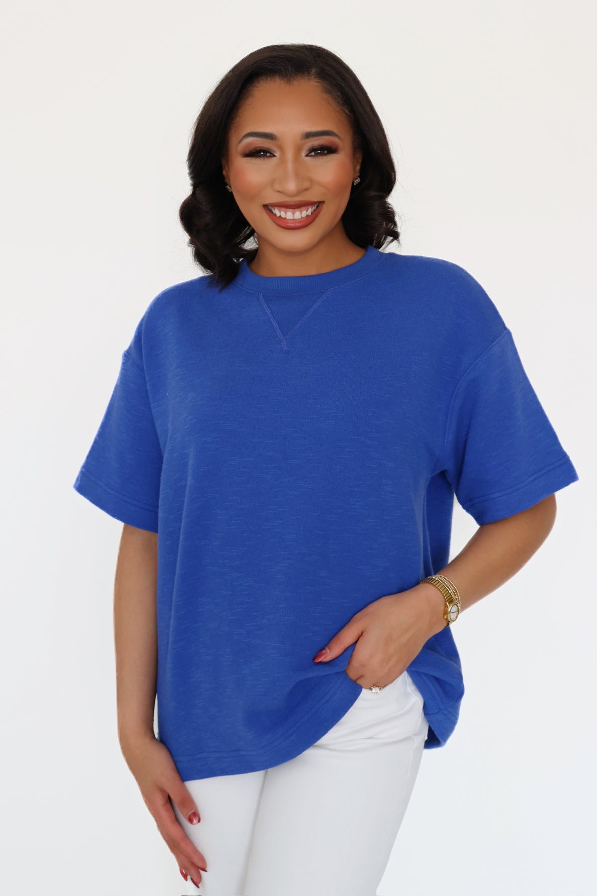 Crafted from textured and slub french terry, this design features a classic ribbed crew neckline accented by a traditional V-stitch detail. It boasts wide, comfortable short sleeves with ribbed cuffs. Cut in a generous relaxed, boxy fit, this piece pairs perfectly with high-waisted denim and sleek sneakers for an easygoing vibe.