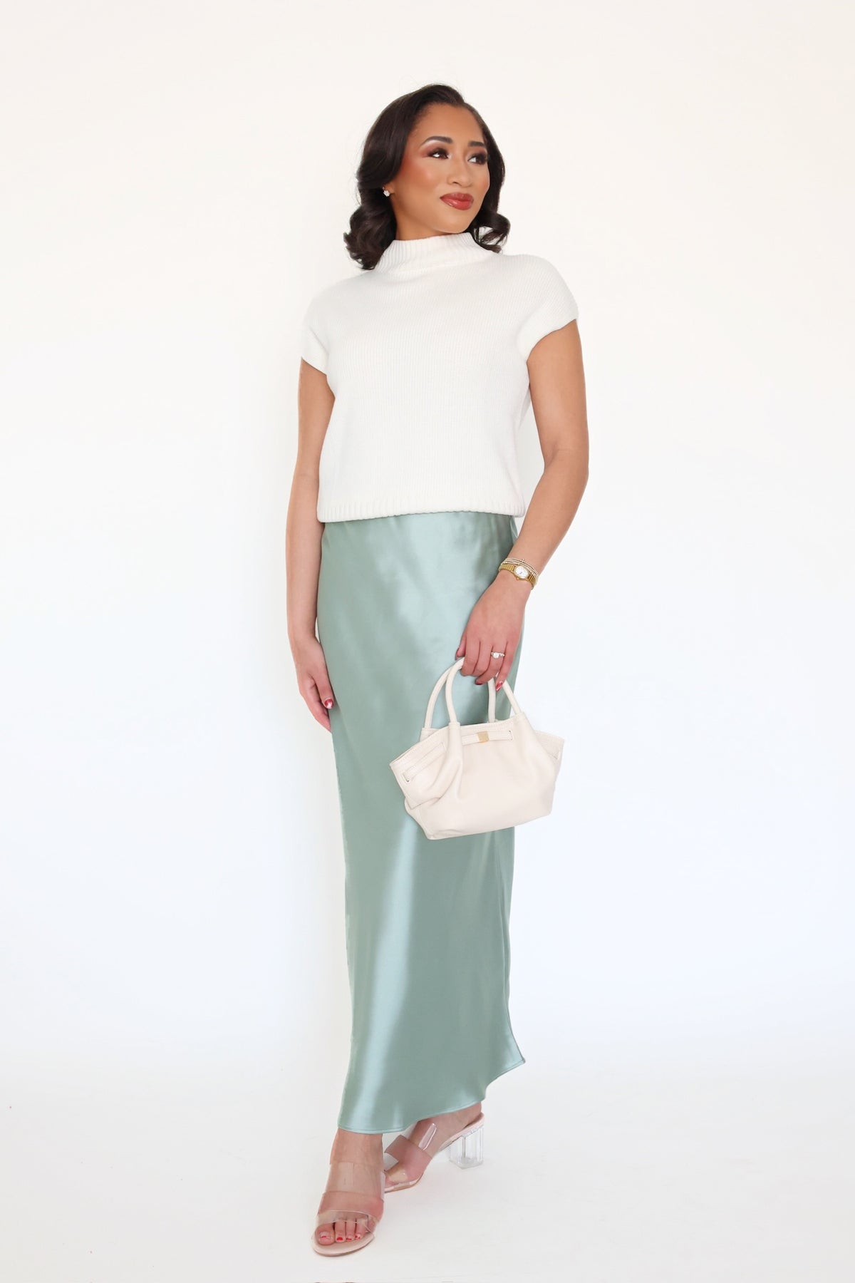 Crafted from smooth satin, this design boasts a sleek high-rise silhouette with an internal elastic waistband for a secure, comfortable fit. The cut is a timeless bias-draped maxi length. This skirt pairs well with a chic, fitted blouse and stiletto heels for a polished and contemporary evening ensemble.