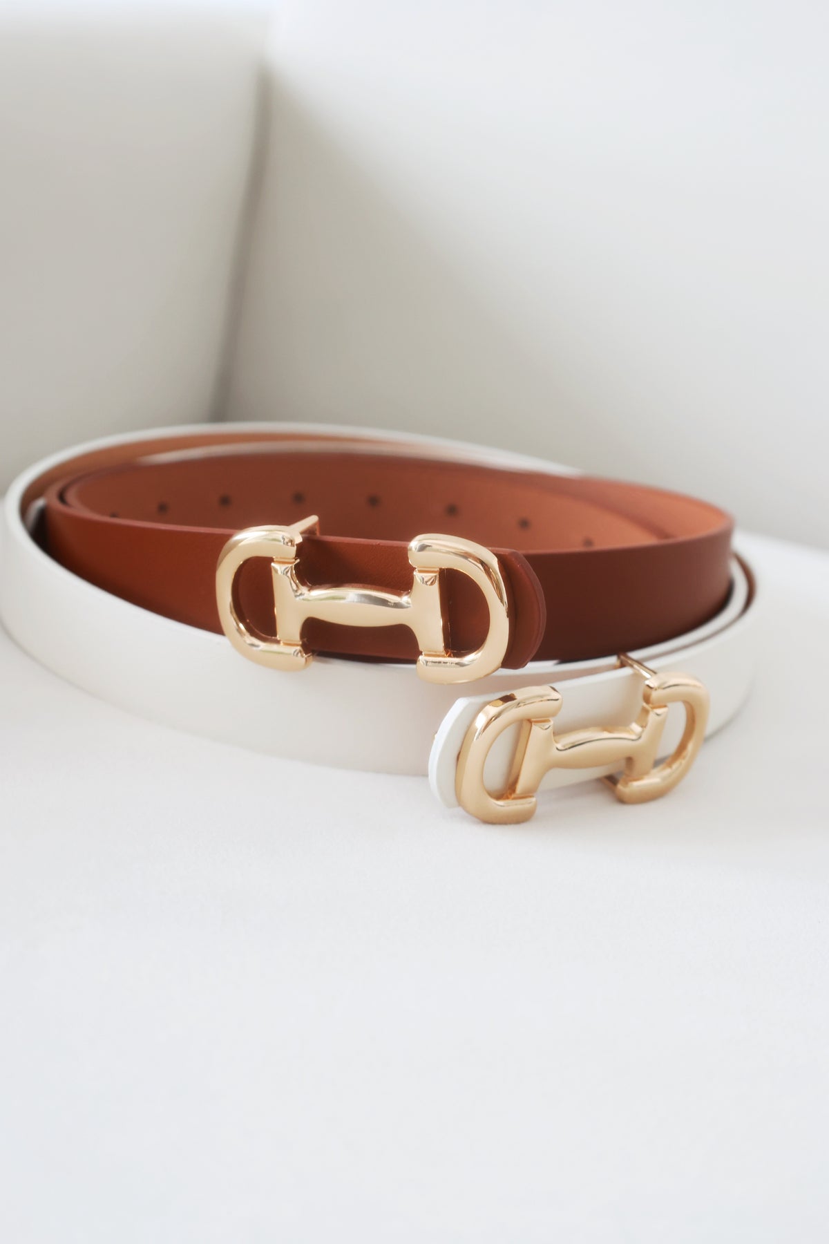 Modern Horse Bit Buckle Belt featuring a sleek, minimal silhouette with a polished gold horse-bit inspired buckle. Designed with a smooth faux leather strap and adjustable fit, this belt adds a refined equestrian touch to both casual and dressy looks. Perfect for styling with dresses, denim, or tailored pieces, this versatile belt elevates everyday outfits with a chic, timeless finish.