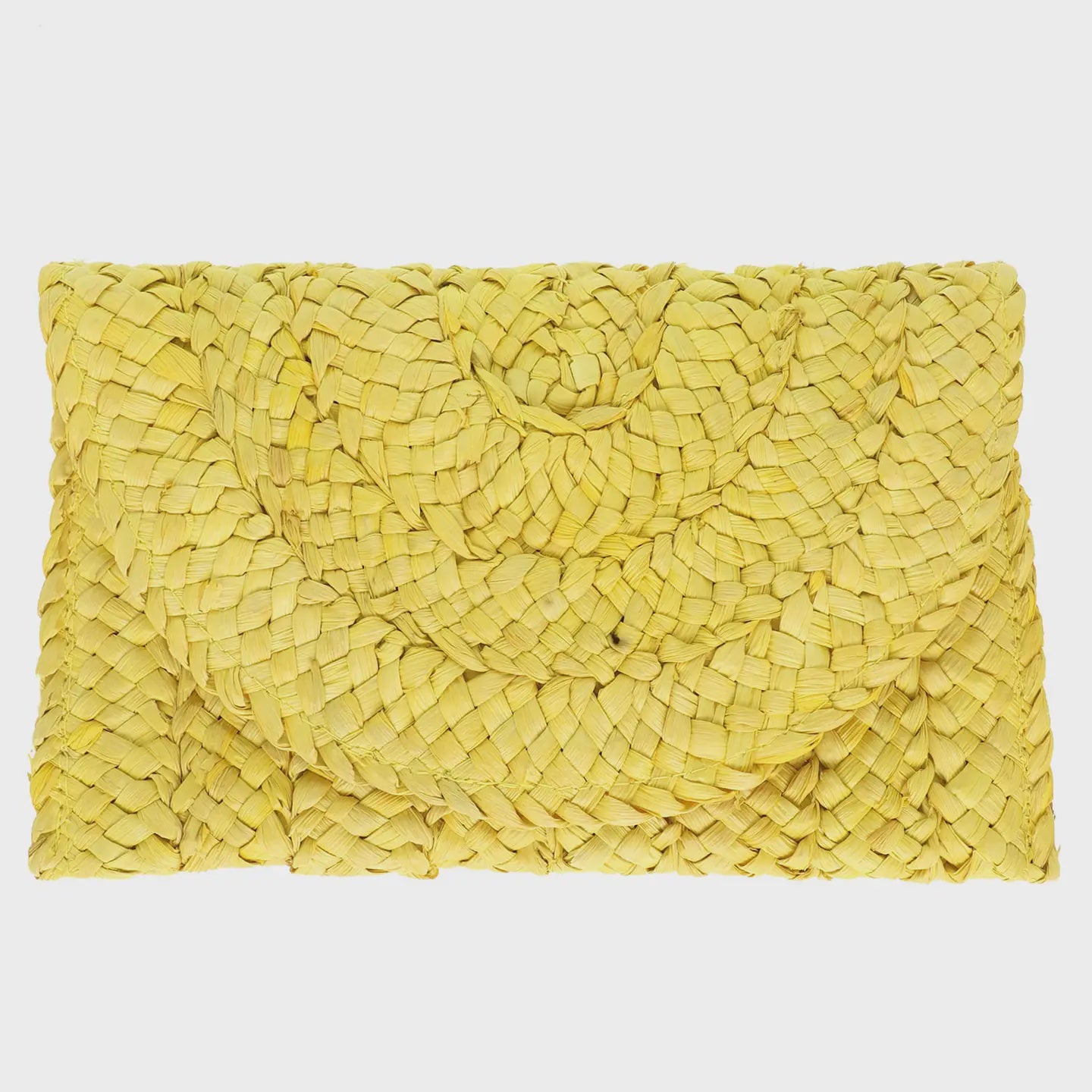 Envelope-style clutch featuring handwoven raffia texture and snap closure