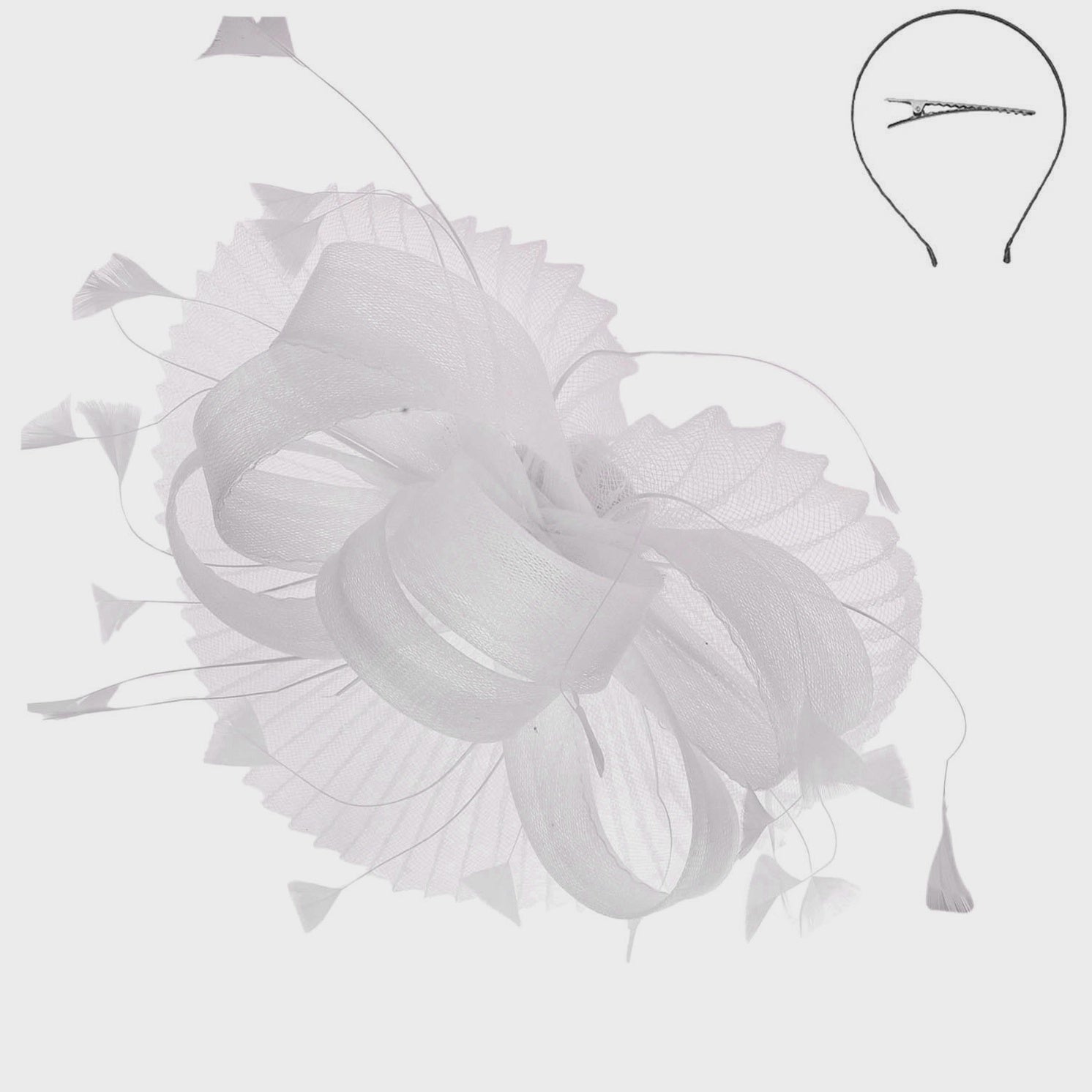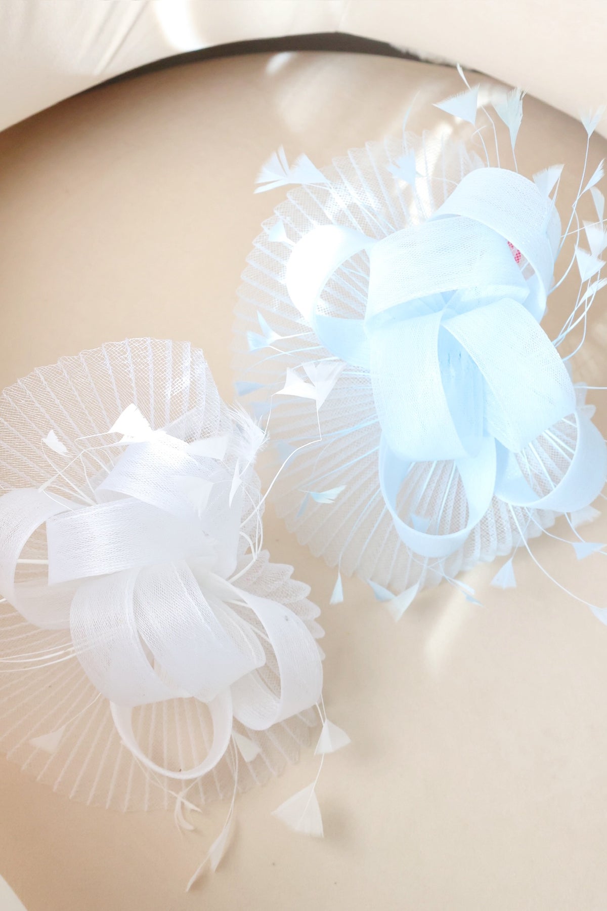 - Organza mesh, feathers, and beaded detailing; clip or headband